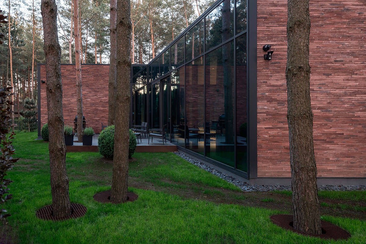 È stato scelto uno schema a forma di plus con cortile interno, che ha permesso di creare tali spazi interni, rientranze, che distanziano naturalmente la facciata dal lotto vicino. Inoltre, grazie a ciascun elemento di quella forma più, sono stati creati fianchi separati, come case separate, e sebbene lo schema dei volumi della casa sia abbastanza chiaro, allo stesso tempo il contorno della casa è dinamico, consentendole di rispondere all’ambiente forestale esistente.