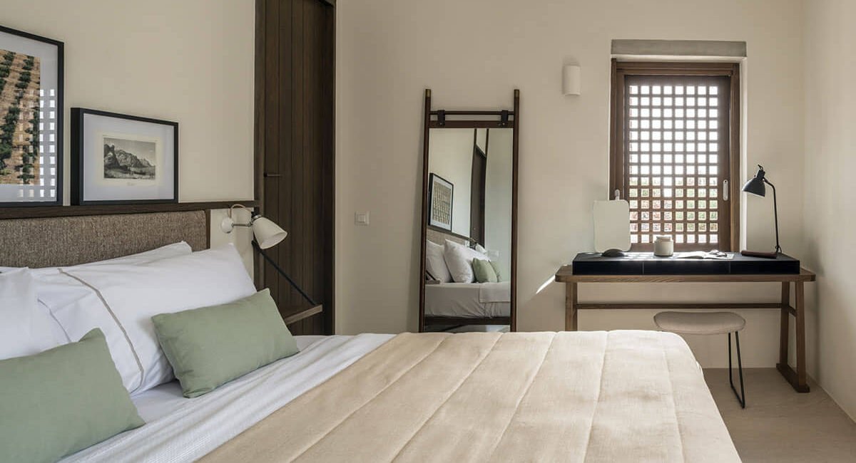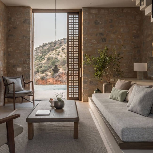Diventa così possibile trasferire la propria vita fuori casa, in questo caso in una corte divisa in un insieme di spazi che possiedono qualità e cornici visive diverse. Pergole, angoli appartati per la quiete e la meditazione, spazi abitativi, piscine a sfioro che sfumano i confini dell’orizzonte e del cielo: tutti concorrono a creare lo sfondo esterno delle case stesse.